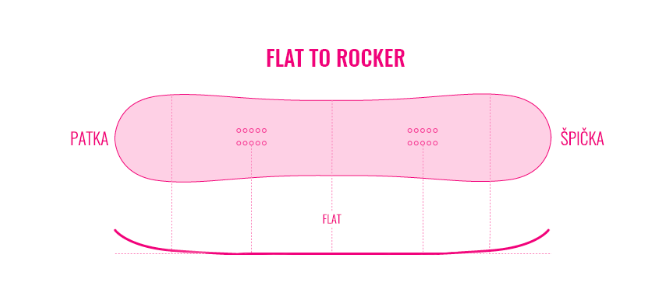 Flat pod nohama dodává pohodovou stabilitu a chová se jako takovej mírnej brácha Camberu. Rockery na koncích pomáhaj od toho pověstnýho zařezávání hran, kterejma tě čas od času vystraší jak čistej Flat, tak čistej Camber.